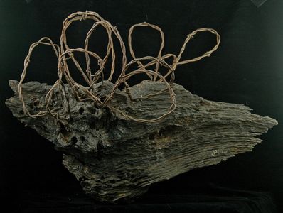 Barbed wire from an abandoned ranch fence was fashioned to resemble a cluster of prickly pear growing out of a weathered tree limb. The barbed wire has been painted gold with a hint of gold on the weathered tree. 19-1/2"w X 16"t X 9"d. Weight 4.10 lbs.