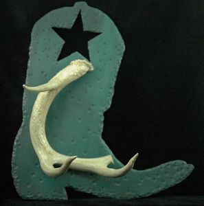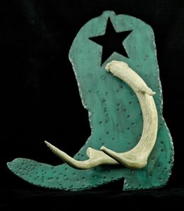 Cut with plazma torch from 9 guage cold rolled steel and hand tooled with a hammer. Painted and dry brush accent added with a satin finish. Polished white tail deer antler attached. 12"w X 14-1/2" t X 8-1/2"d. Weight 4.10 lbs