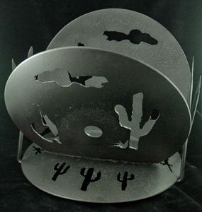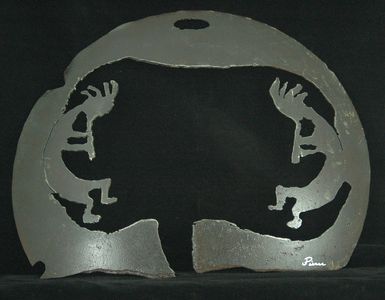This piece of art is comprised of three used 16 inch plow discs with Southwest designs cut into them with a handheld plasma cutter. There are two crossing hand forged spears at each side of the piece. It is 17 inches wide, 16-1/2 inches deed, and 14-1/2 inches tall. It weighs 23.10 lbs,