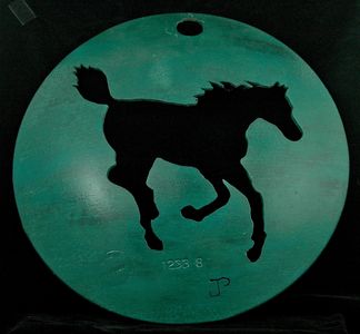 The metal pony is cut from a used plow disc freehand with plasma cutter with the center shaft hole filled in. It is mounted in a piece of weathered wood. The pony has a painted finish. 21"W X 13"H X 7"D Weight 4.3 lbs.